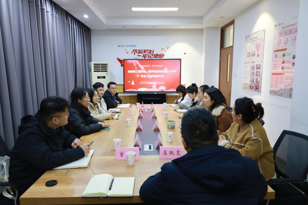 12月27日下午,物联网工程学院、数字科技与创意设计学院学工交流会暨第二期“联动思享+”学生工作研讨会在物联网工程学院D112会议室举行。物联网工程学院党委副书记、副院长吴妍,数字科技与创意设计学院党委副书记、副院长李萍,以及双方学院全体辅导员参会。