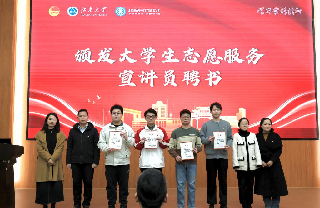 聘书颁发环节,校团委副书记单云婷、物联网工程学院党委副书记吴妍、无锡市滨湖区团委副书记肖江,校学生工作处学生管理科科长杨艳共同为四位优秀的物联追“锋”者颁发“大学生志愿服务宣讲员”聘书,激励四位宣讲员肩负起传播志愿服务精神的重任,以自身经历激励更多同学投身志愿服务。