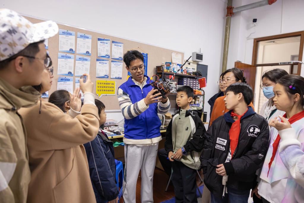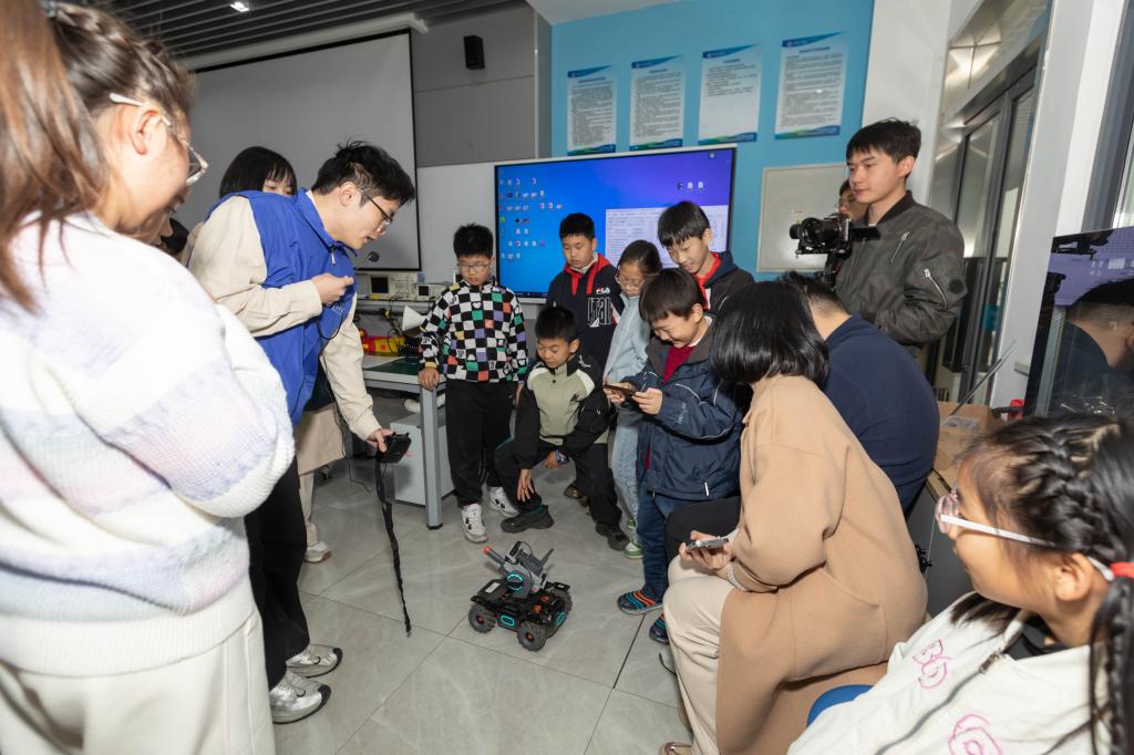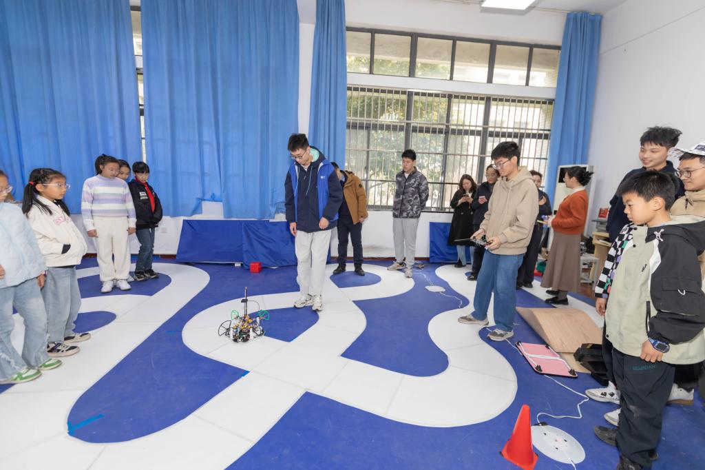 物联网大学生创新实践基地的科技探秘是此次研学的亮点。走进电子设计俱乐部,各种实验仪器揭开了电子技术的神秘面纱。在智能车和机器人俱乐部里,孩子们围绕智能循迹车、四足机器人、无人机、气垫船等科技作品的工作原理和弹跳结构的机械奥秘展开热烈讨论和互动交流。启发式的教学让抽象的理论知识在互动中转化为可感知的科技实践,充分培育了孩子们的科学思维。
