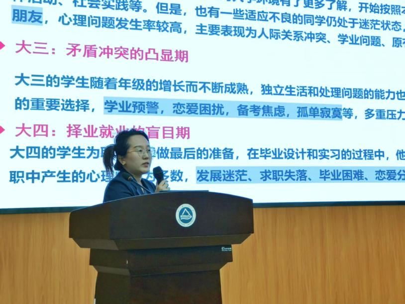 接着,学院心理辅导员张圆化身心灵引路人,围绕角色定位和工作职责、常见心理问题识别、朋辈互助技能、心理危机干预以及校内外心理援助资源等方面展开详细讲解,她聚焦心理问题线索挖掘、识别技巧及应对策略,通过理论讲授与案例解析相结合的方式,有效提升了寝室长及班级心理委员工作能力和水平。此外,张圆分享了一系列生活实用的心理保健方法,引导大家学会觉察自身情绪状态、重视自我身心关照。最后,张老师又介绍了黄漫