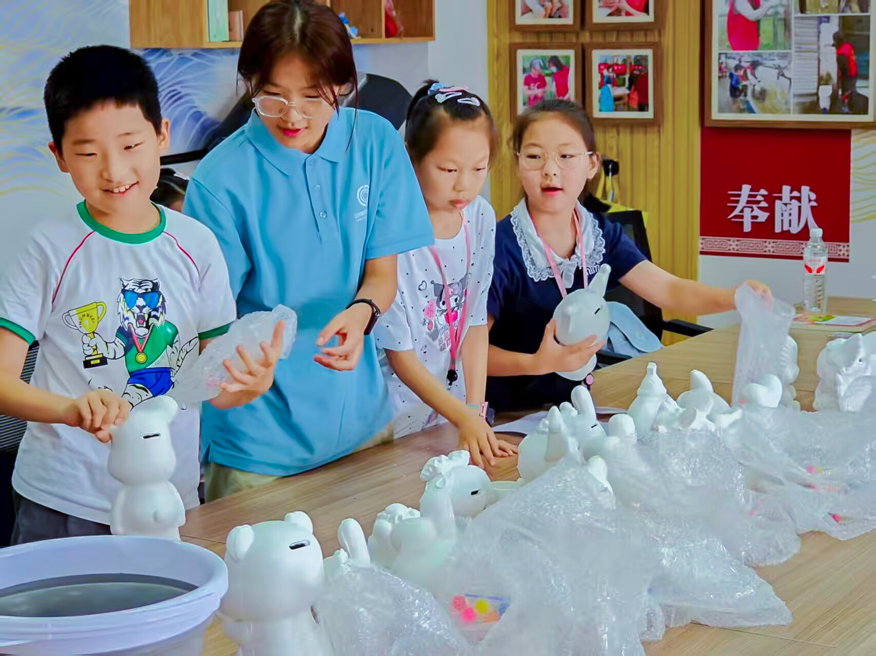 巧手作·润心田:手工体验表心声。活动现场同步设置了“手工润心”体验区。洁白的石膏娃娃整齐排列,静候孩子们赋予其生命与色彩。涂绘完成后,实践团组织了分享环节。孩子们围坐一圈,展示作品并分享创作过程中的心绪与感悟。一位小朋友说到:“涂绘时,仿佛将烦恼都涂抹掉了,现在心里特别轻松。”这样的分享不仅加深了彼此的情感联结,更让大家深刻体会到情绪表达与管理的重要性。
