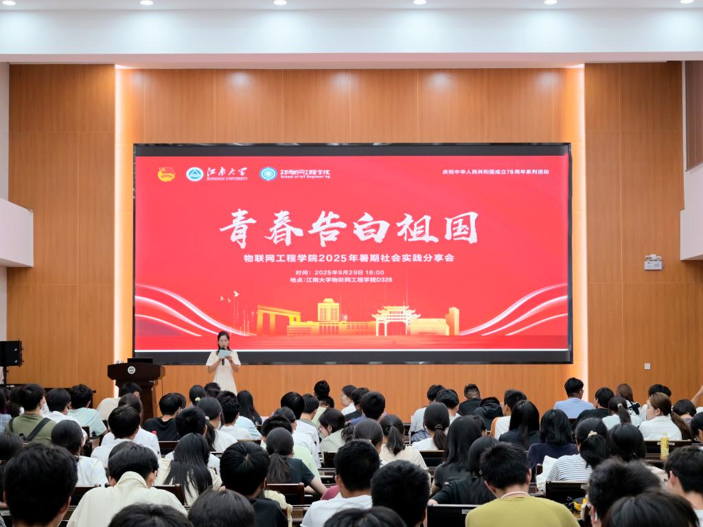 为深入学习贯彻习近平新时代中国特色社会主义思想,激励广大青年坚定理想信念,强化责任担当,争做时代先锋,在庆祝中华人民共和国成立76周年之际,物联网工程学院2025年“青春告白祖国”暑期社会实践成果分享会举行。学院党委副书记吴妍,分团委书记洪筱,辅导员王雪冰、屈跃宽、沈滔、曾磊、刘子健、周显宜,暑期社会实践团队代表及部分2025级本科新生参加本次活动。
