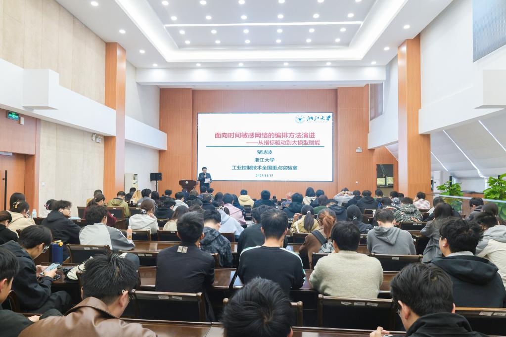 近日,江南讲坛第151期在物联网工程学院D328举行。浙江大学求是特聘教授贺诗波应邀作题为《面向时间敏感网络的编排方法演进:从指标驱动到大模型赋能》的专题报告,吸引了150位本硕学子聆听。活动由副院长王子赟主持。