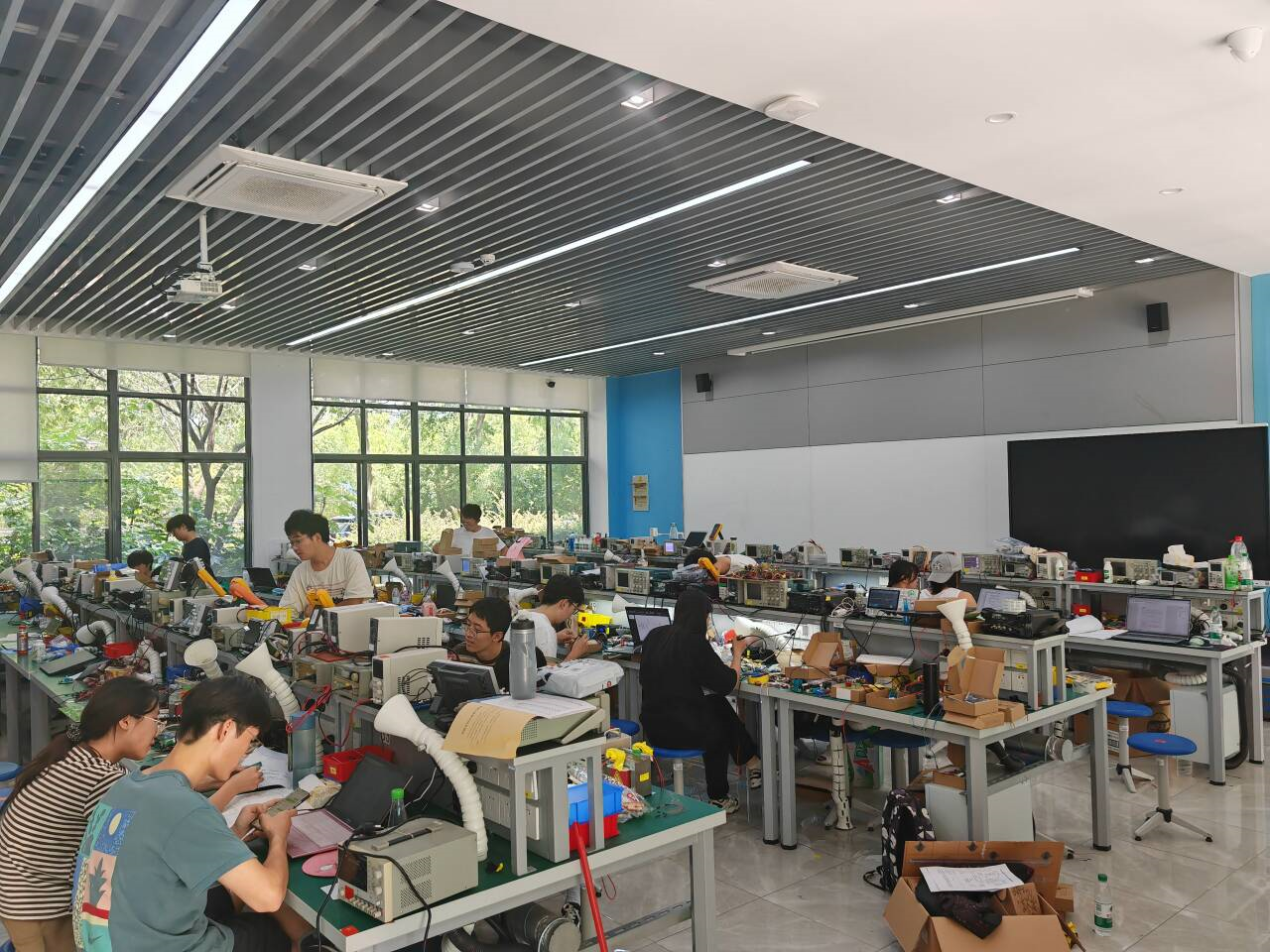 本次比赛共有8个赛题,内容涉及AC—AC变换电路并联运行、单相功率分析仪、无线传输信号模拟系统、立体货架盘点无人机系统、三子棋游戏装置、磁悬浮实验装置、自动行驶小车,赛题具有很强的综合性、设计性、工程性和挑战性,重点考察参赛同学的电路设计能力和编程能力。7月29日8时,大赛正式开始,17支参赛队伍在大创基地的封闭实验室内开展方案设计、理论推导、仿真验证、硬件电路搭建、软件设计编程、系统调试等。经过四天三夜高强度的电子系统设计与制作,顺利完成了参赛作品的线上评测。物联学子凭借扎实的专业知识、良好的创新设计能力和优秀的团队合作意识,按照大赛要求顺利完成了作品设计和制作,取得了佳绩。
