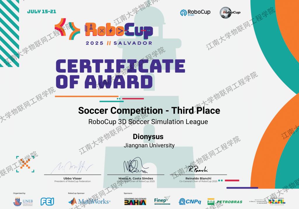 近日,2025年RoboCup机器人世界杯在巴西成功举办。物联网工程学院Dionysus团队荣获2025年RoboCup机器人世界杯3D Soccer Simulation(仿真三维组)世界季军,追平了中国高校队伍在该组别近十年来的最佳成绩。