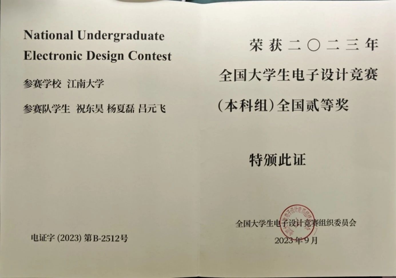 一等学业奖学金、金龙鱼奖学金、校级三好学生荣誉称号。大学期间积极参与科研竞赛,完成校级大创一项,获得国家级奖项三项和省级多项。曾获2023全国大学生电子设计大赛二等奖,江苏省一等奖;2024全国蓝桥杯大赛EDA赛道二等奖,江苏省一等奖;2023全国蓝桥杯大赛嵌入式赛道优秀奖,江苏省一等奖等。在学业之余积极参与学生工作,入学以来担任班长,校电子设计俱乐部副部长,班主任助理等职责,组织和带领物联网2101班获校级先进班集体。现推免至东南大学。