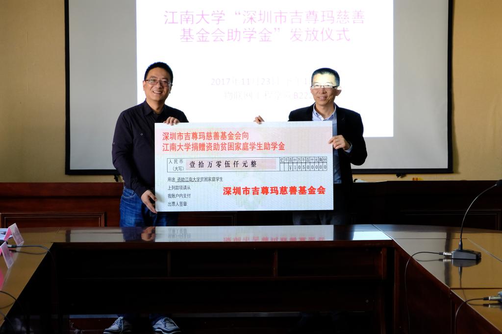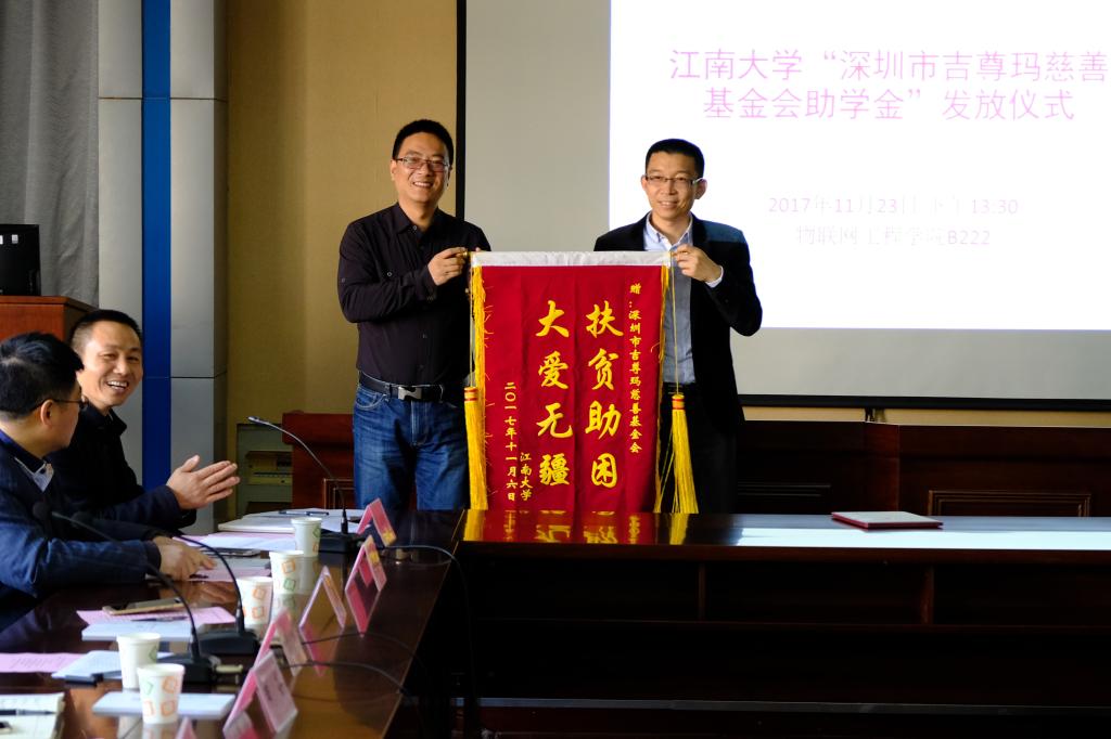 “深圳市吉尊玛慈善基金会助学金”发放仪式在物联工程学院B222会议室举行。嘉宾和受资助的学生围坐在会议室,会场气氛和睦温馨。物联网工程学院党委副书记、副院长耿向阳主持了仪式。