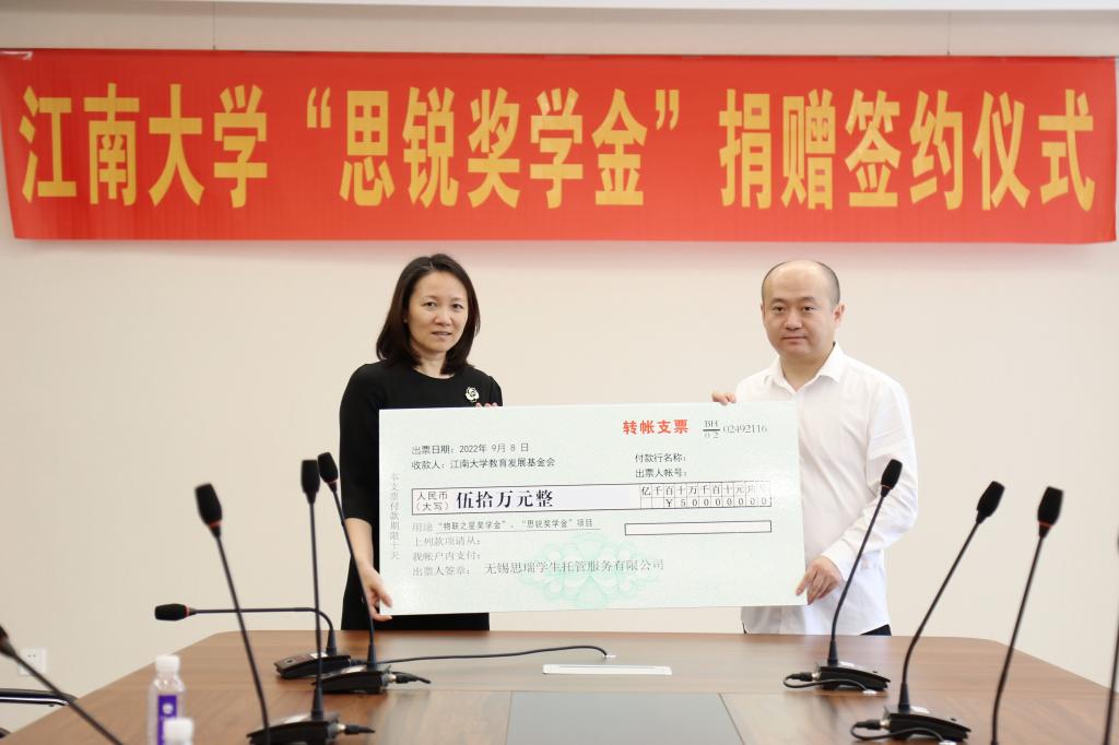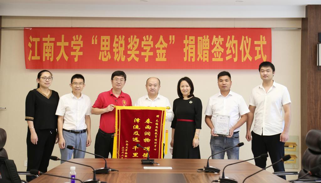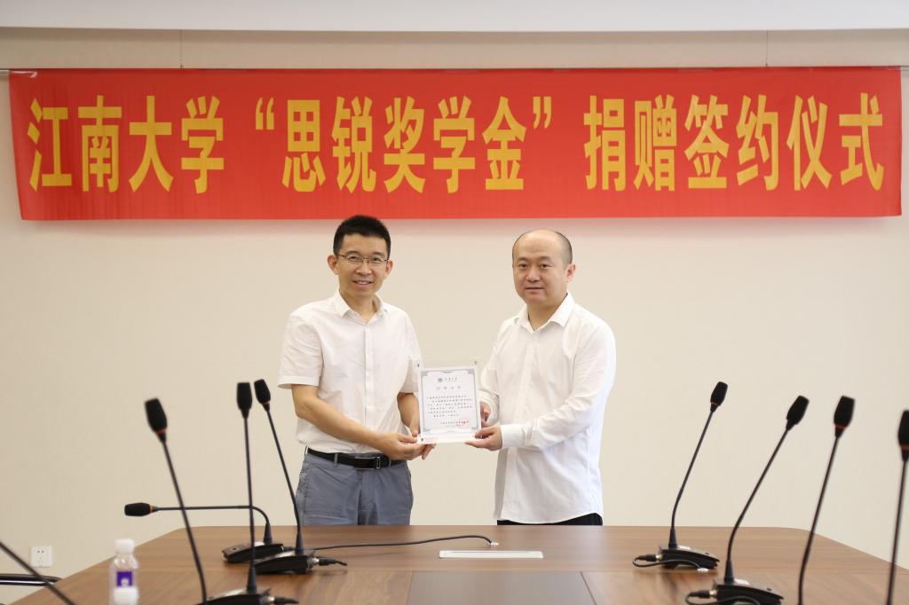 “思锐奖学金”捐赠签约仪式在物联网工程学院B222会议室举行。无锡思锐教育培训中心校长徐建伟、执行校长曹猛、直播校长丁鹏飞,黄漫