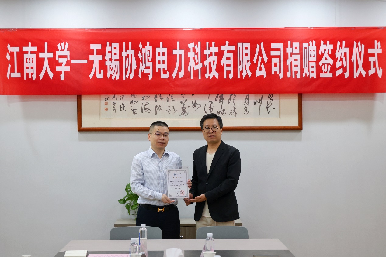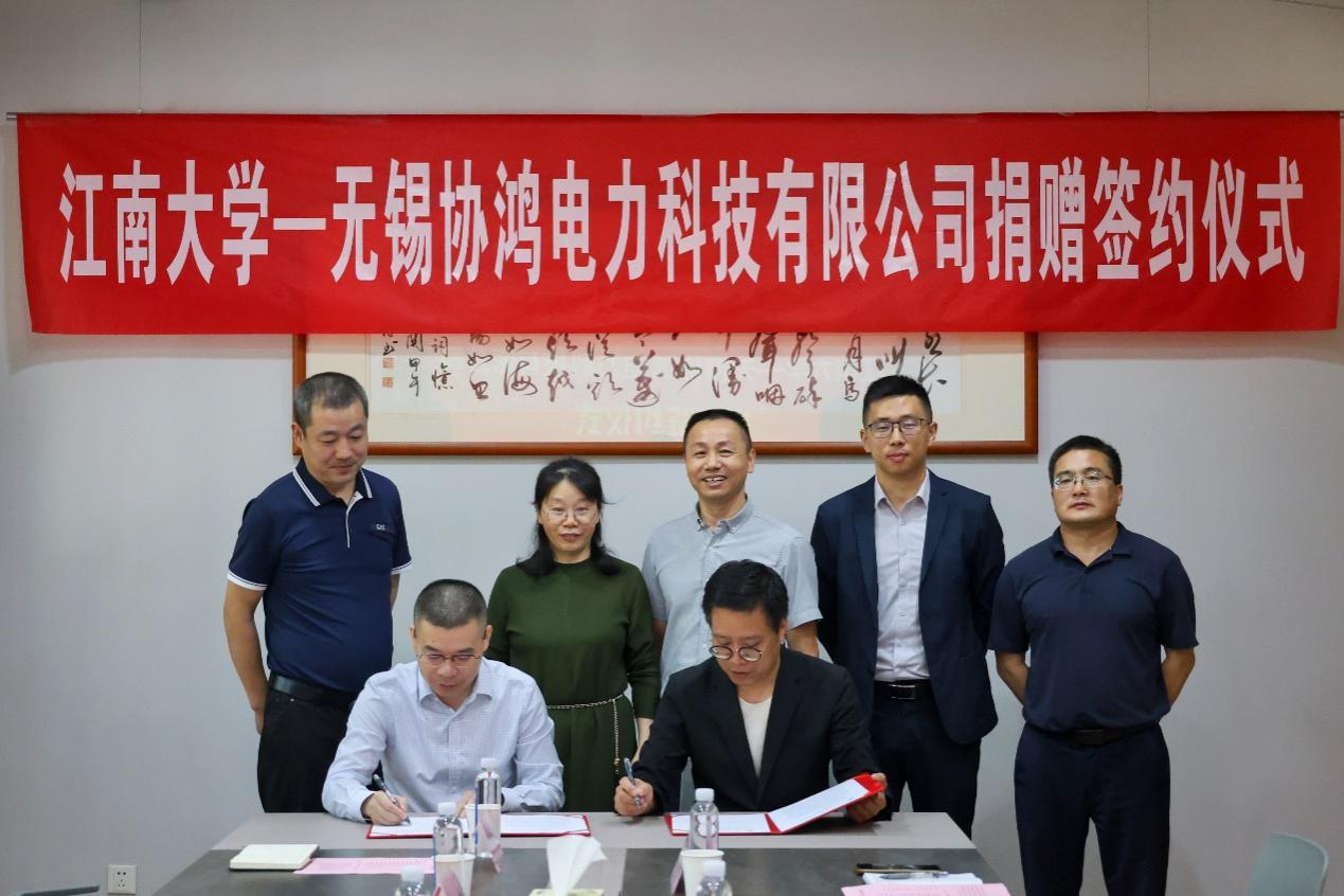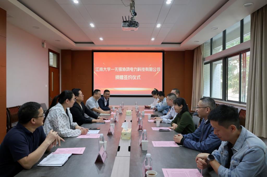 ---无锡协鸿电力科技有限公司捐赠仪式在物联网工程学院D206会议室举行。无锡协鸿电力科技有限公司总经理雷协林、副总经理唐建红,无锡格策电气有限公司总经理王志刚、研发工程师王书青、朱国会、办公室主任邓宛,黄漫