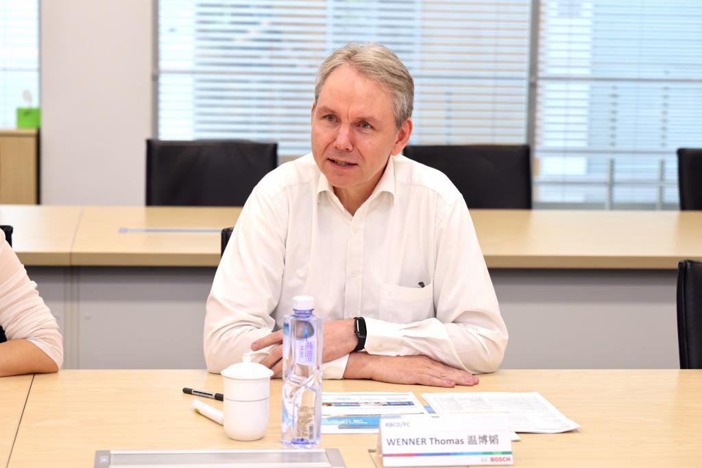 座谈会上,温博韬对符惠明一行的到访表示热烈欢迎,并介绍了博世集团的发展理念、集团详情以及集团的业务开展领域等情况。他指出,博世集团秉承“根植本土、服务本土”的理念,深度融入了中国经济的发展,为中国市场和用户提供汽车与智能交通、工业、消费品以及能源与建筑技术领域的先进技术和解决方案。闻立衡从产品性能及技术、工业4.0支持卓越生产、燃料电池工业化生产线三个方面详细介绍了博世动力总成的技术发展情况。