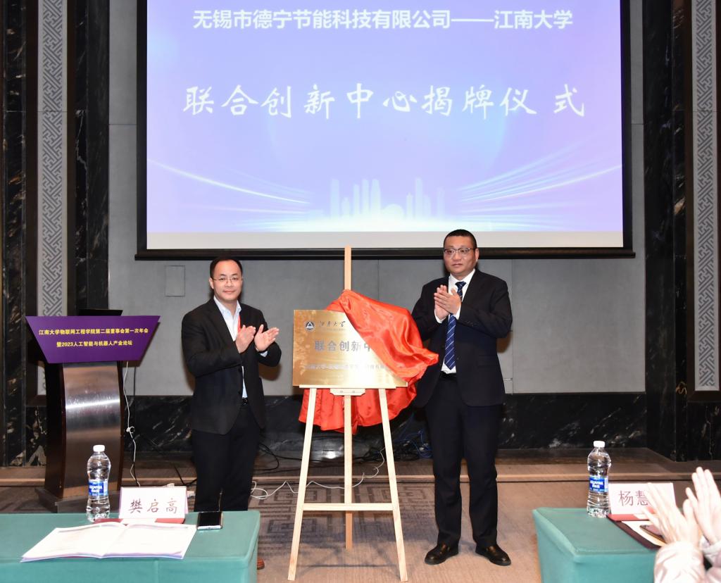 —无锡市德宁节能科技有限公司”联合创新中心揭牌仪式。樊启高介绍了中心前期筹备情况,他表示,无锡是物联网、智能制造、集成电路的产业高地,具有极大的产业基础优势;企业有人才培养的需求,而学生也需要高质量的就业,在此背景下,联合创新中心无疑是双方合作共赢的必然选择。物联网工程学院将不负协会与企业的期望,依托学院电子信息学科和省部级科研平台集中优势,在中心联建、课题联研、人才联培等方面进一步产出成果。随后,无锡市德宁节能科技有限公司董事长唐逸先生与樊启高共同为联合创新中心揭牌。