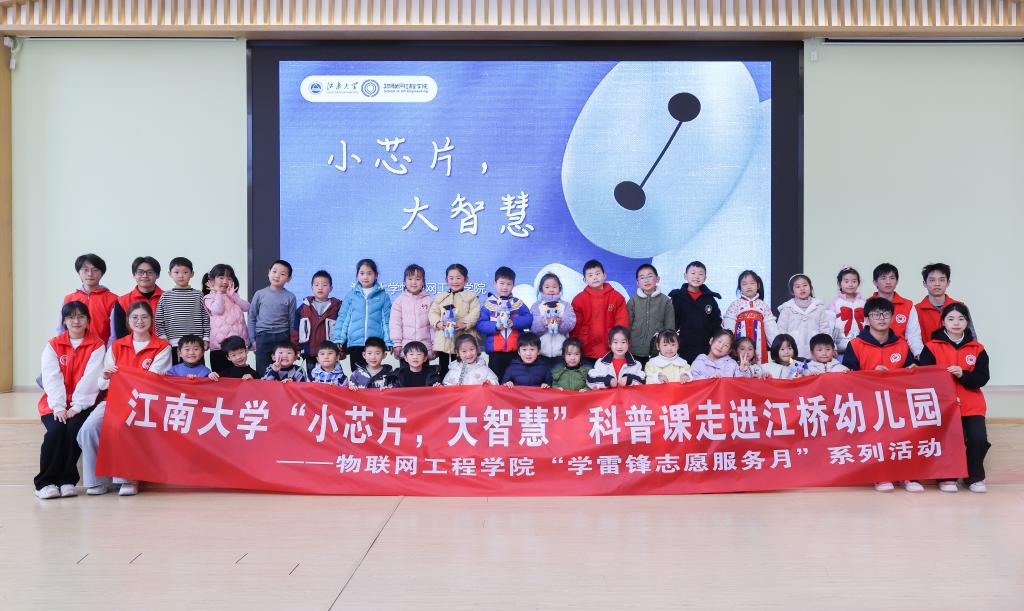 物联网工程学院“雷锋”特称团支部走进无锡市新吴区江桥幼儿园,为孩子们带来一堂奇妙有趣的《小芯片,大智慧》公益科普课,在孩子们心中播下科技梦、强国梦的种子。