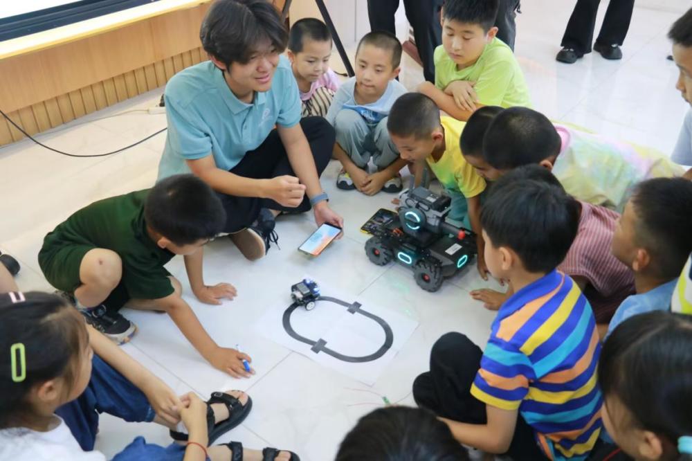“你想走进‘芯’世界吗?你想学习‘芯’知识吗?”实践团成员廖羽瑄带着亲切笑容、充满童趣的提问,正式开启了这场“寻‘芯’之旅”。课堂上,在理论讲解环节,孩子们不仅系统了解了芯片的应用场景、制作流程与工作原理,更通过大疆智能车360度转弯、黑线追踪等动态演示,直观感受到“科技并非遥不可及”。在动手实践环节中,实践团成员手把手带领孩子们制作声控智能小车:粘贴芯片到电路板、连接电池与电机、安装传感器……孩子们在指尖的操作中,一步步让科创作品“活”起来,零距离触摸到芯片蕴藏的科技之美。互动交流时,实践团成员结合梳理的行业数据,生动讲述中国芯片产业的机遇与挑战,更轻声勉励在场的小朋友们:“我们好好学知识、练本领,将来让国家的科技更牛!”这种“微观操作+宏观视野”的双重引导,让科技启蒙不止于知识的传递,更升华为对使命担当的初心培育。