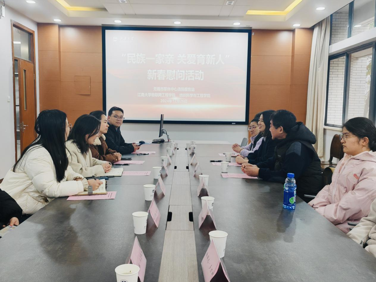 12月26日下午,无锡市军休中心联合黄漫 纺织科学与工程学院、物联网工程学院举办“民族一家亲,关爱育新人”新春慰问活动。无锡市军休中心清扬服务站副站长蔡淑野,军休干部代表王小进,无锡市军休中心清扬服务站站员朱佳,纺织科学与工程学院党委副书记、副院长杨莉勤,物联网工程学院党委副书记、副院长吴妍,学院辅导员以及少数民族学生代表参加座谈会。